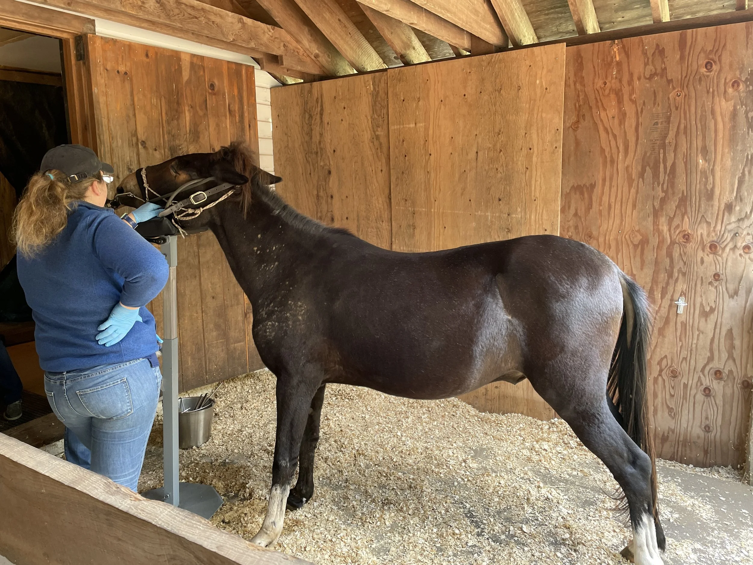 Then, the process began, turning out to be two teeth, It was a long procedure, with instrument after instrument inserted into his mouth, long pliers and pincers, sounding more like automotive repair than dentistry. There was tapping, pulling, re-inserting, tapping and pulling some more, until the teeth were finally loose. Then it was over, and Merle stood there dumbfounded. We hoped this would be like childbirth in the 1950s, that he wouldn’t remember. He staggered around like a dazed boxer, feet spread with his head hanging down low. He’d taken so much tranquilizer and had still tried to resist during the procedure. Eventually, he came to, and strolled out into the paddock and started eating hay.