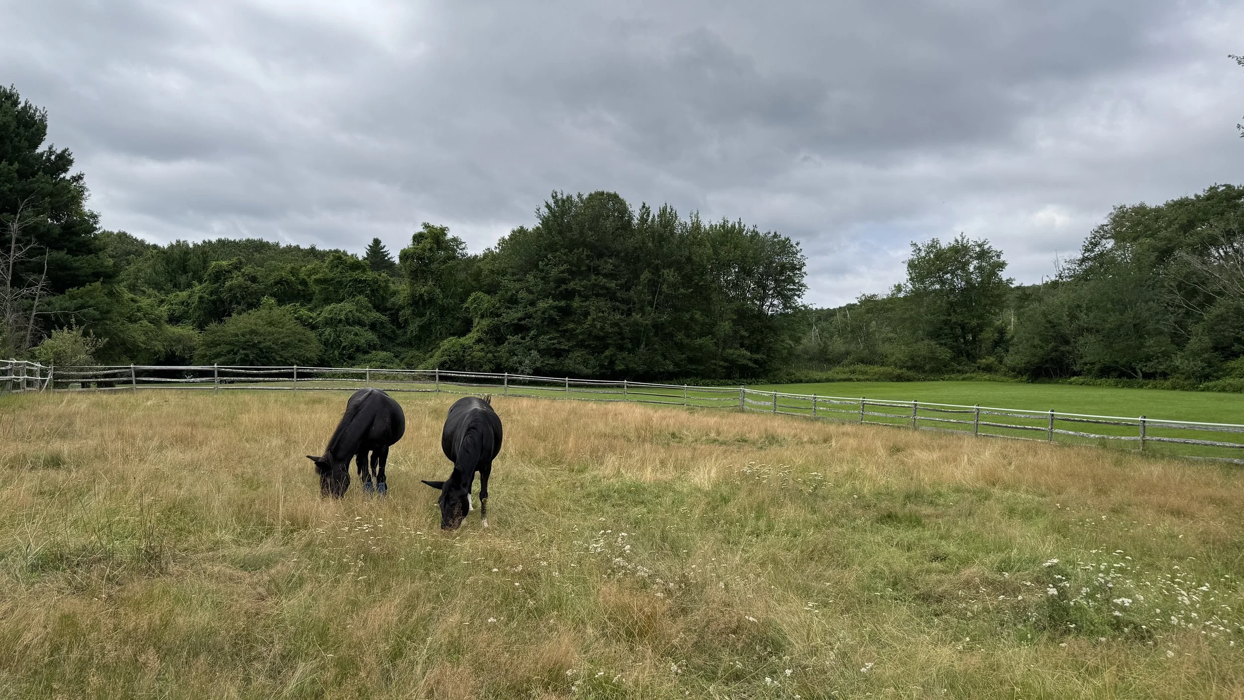 We've had neighbors’ horses escape into our yard before. It’s usually easy to catch them. Jenny tells me they like to be caught, meaning, I suppose, they like to be safe and protected. She gently leads one away while the other follows.