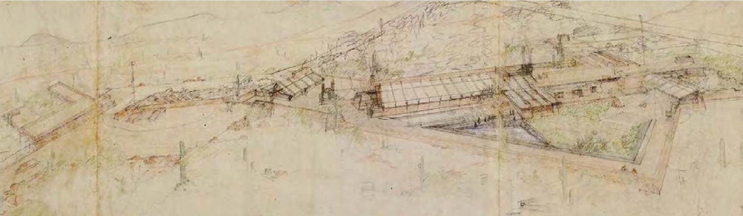 Wright had few resources at the time, however he had a considerable reputation. So in his final incarnation, he devised a school where apprentices would pay to come to Taliesen West, and would learn the arts of farming, building, cooking, and entertaining. They would also be expected to act as draftsmen for his remaining architectural projects. The winters were spent at Taliesen West, and the summers at Taliesen East with the apprentices handling the entire move between. It was a brilliant plan, providing Wright and Olga an extensive staff, a winter residence, and a steady income. Such an enterprise requires a certain suspension of disbelief and Taliesen West was informed by a certain theatricality in which the ritual of each of the activities was given an honorific significance. Over the years Taliesen developed a devotional following and a number of apprentices went on to brilliant, if idiosyncratic careers; Bruce Goff and John Lautner being noteworthy.